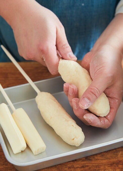 チーズが溶け出さないように、生地ですっぽり包むのがポイント。割り箸と生地をしっかり密着させておこう!