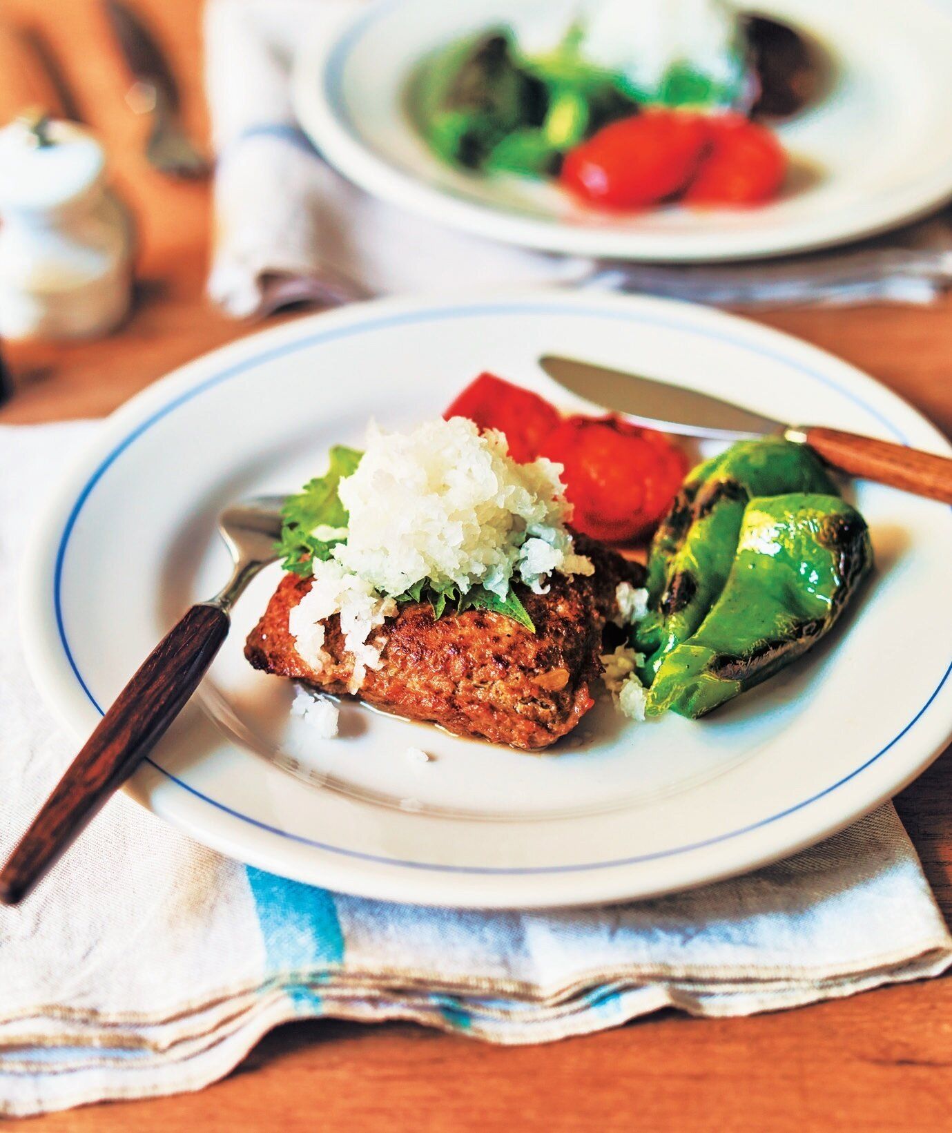 (3)焼き色がついたら裏返し、水大さじ4を加えたら再びふたをして5~6分焼く。ピーマン、トマトも一緒に焼く。器に盛り、ハンバーグに青じそ、大根おろしをのせる。