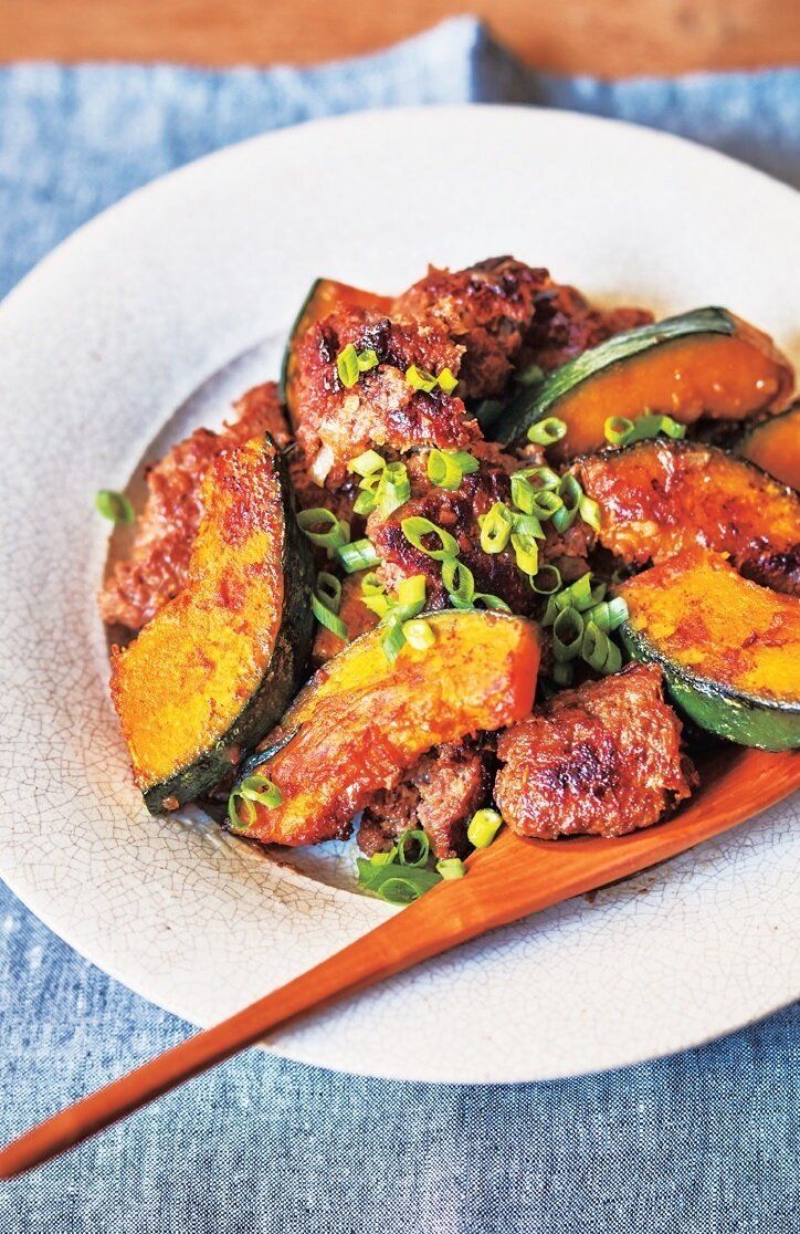 (2)フライパンにひき肉を凍ったまま4等分にして入れ、かぼちゃを並べる。ふたをして弱火にかけ、4~5分蒸し焼きにする。焼き色がついたら裏返し、ひき肉を木べらで粗くほぐす。ざっくりと炒め合わせて器に盛り、万能ねぎを散らす。