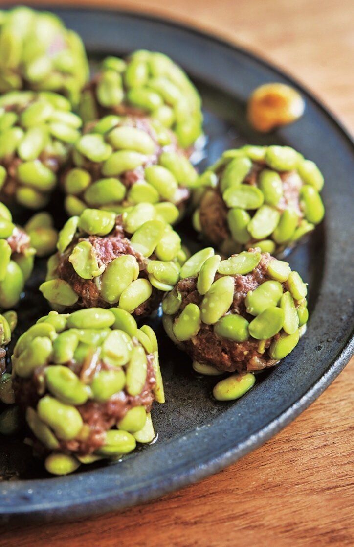 (2)ひき肉をスプーンで一口大ずつすくい、枝豆をまぶしつけて、丸く形を整える。耐熱皿にのせて、ふんわりとラップを掛け、電子レンジで4~5分加熱する。好みで練り辛子を添える。