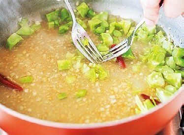 茎をつぶして、パスタにからみやすい状態に。フライパンにさわってやけどしないように注意。