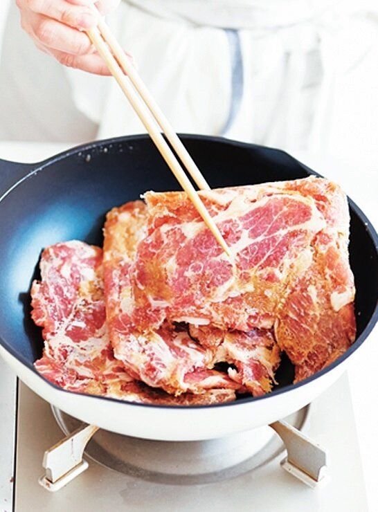 (2)フライパンに豚肉を凍ったまま割り入れ、ふたをして中火にかける。蒸し焼きにし、肉の色が変わってきたら裏返してほぐす。