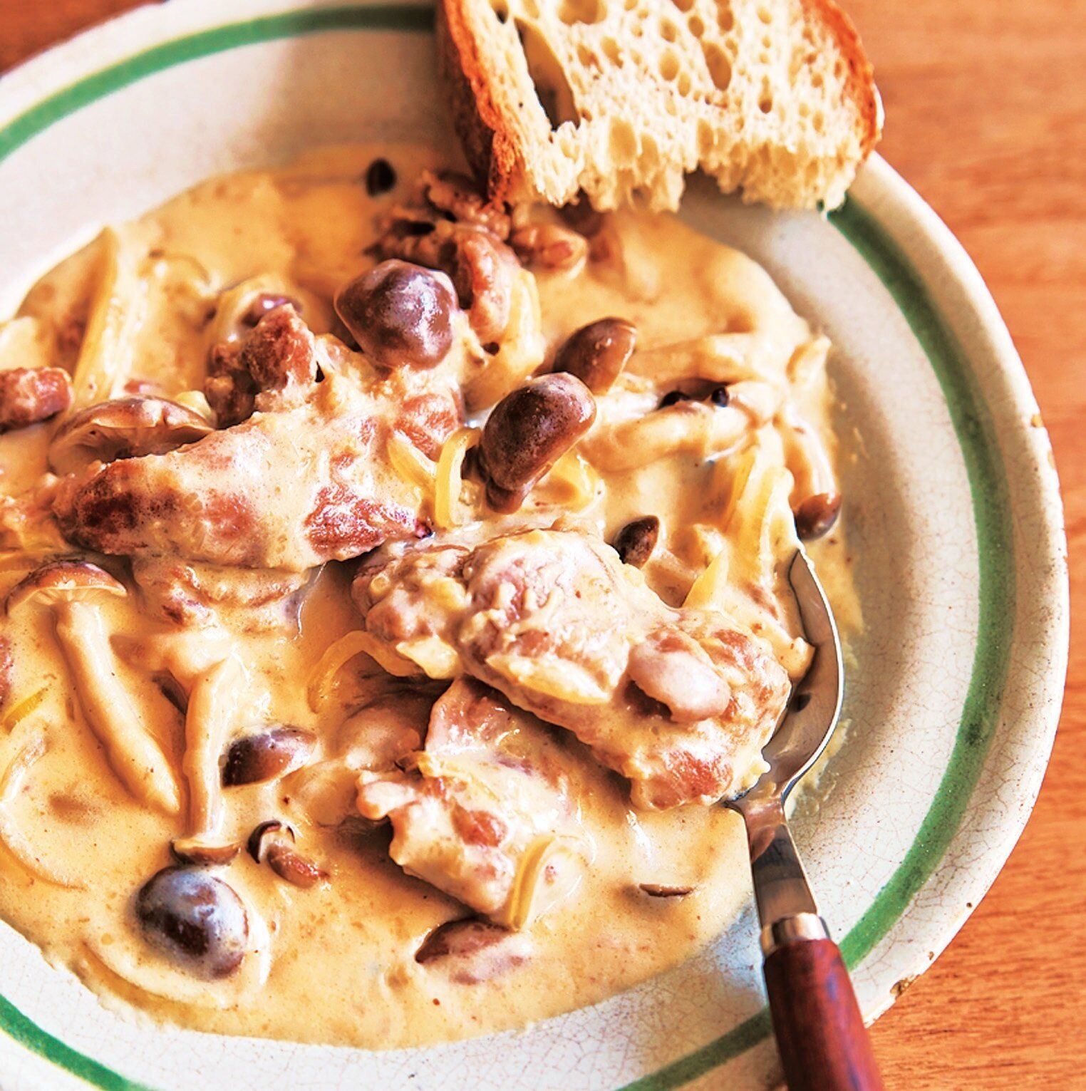 (3)(2)に薄力粉をふり入れて混ぜ、粉っぽさがなくなったら、牛乳を少しずつ加えてのばす。[A]を加えて2~3分煮て、とろみがついたら塩、こしょうで味をととのえて器に盛る。