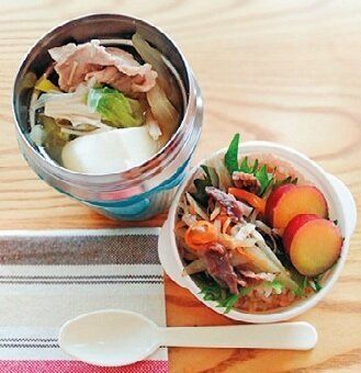 スープ+ミニおかず(ご飯はおかずの下)が定番。おかずは作り置きや「おうち冷食」を活用します。気温が上がってきたら、ジャーに冷たい麺やフルーツとヨーグルトを入れられるので、夏も活躍していますよ。