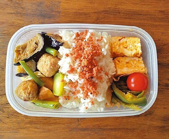 基本、前夜の残り物や作り置きを詰めるスタイル。夫の職場はコンビニが遠く「なんでもいいから用意してほしい」と言われているので、おかずがない日はカップ麺を渡します(汗)。