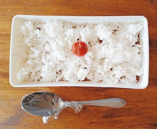 カレーが漏れにくいように、ルウの上にご飯をのせています。「日の丸べんとう~?」と突