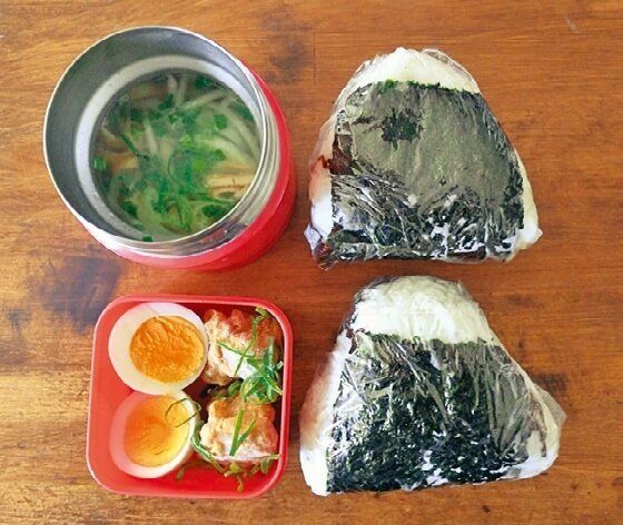 鍋の残りをみそ汁にリメイクしてスープジャーへ。レンチンではなく、鍋で沸騰寸前まで温めて入れるとお昼まであつあつ。おにぎりの具は「昆布+梅干し」と「かつお節+鮭フレーク」。