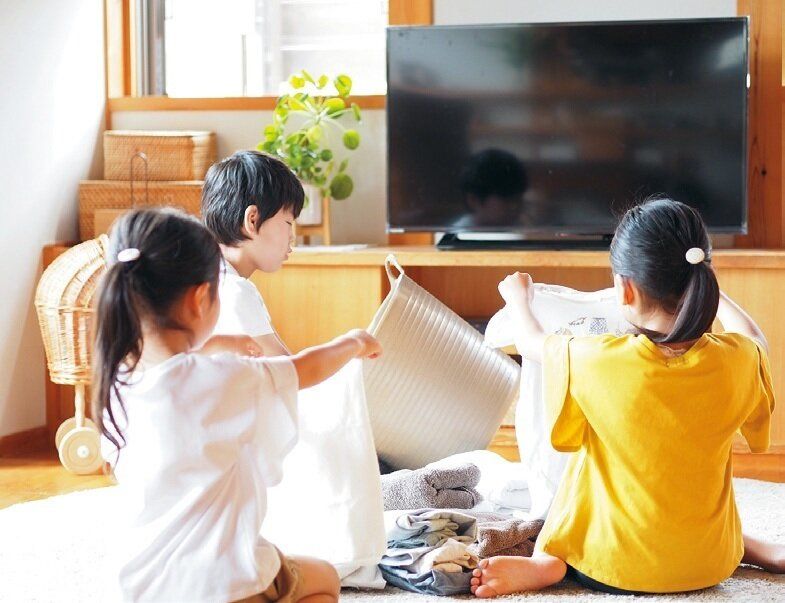 洗濯物たたみは子どもの仕事。1人に頼むと不公平になるから「みんなで一気にたたんでもらう」のがわが家のルール。洗濯物がなくなると部屋が劇的に片づいた印象になります。