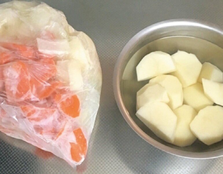 野菜の下ごしらえは、1回の手間で3回分は終わらせます。今日使う分以外は、1回分ずつ保存袋に入れて冷蔵室で保存。玉ねぎとにんじんは同時に使うことが多いので、まとめて袋に入れています。