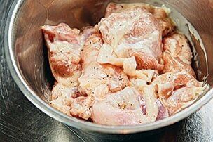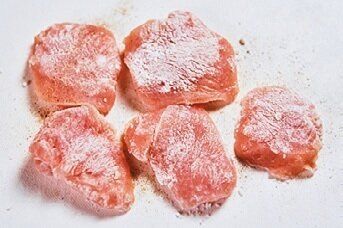 肉に片栗粉をまぶすと、柔らかく仕上がる。