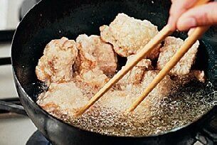 (2)片栗粉をまぶし、170℃の油で揚げる。鶏肉に火が通ったら強火にして、肉の表面を油から出して空気に触れさせる。これを2~3回繰り返すと、二度揚げの代わりになり、表面がカリッと仕上がる。