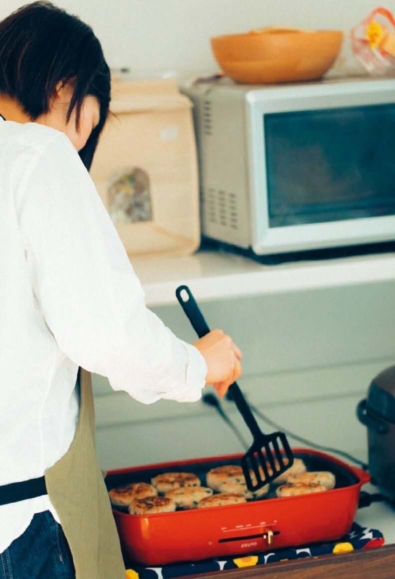 パート勤務や子どものクラブ活動への送迎で大忙しな松山さん。20分で夕ごはんを作るために、「ホットプレートを駆使する」「平日は2品献立」「便利食品を活用する」と決めています。「ホットプレートを使えば、いちどに5人分の料理がおいしく焼けてラク。2品でももの足りなくないように、手間なし食品を常備してラクにごはん作りを乗り切ってます!」。