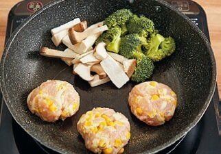 (2)つくねに焼き色がつくまで約3分焼く。つくねは返して副菜はひと混ぜし、ふたをして弱火で約3分蒸し焼きにする。つくねは取り出し、副菜に[A]を加えてさっとからめる。