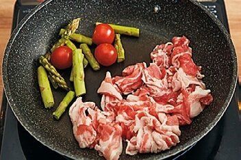 (1)フライパンにサラダ油を中火で熱して豚肉を並べ、空いた所にアスパラガス、ミニトマトを入れる。