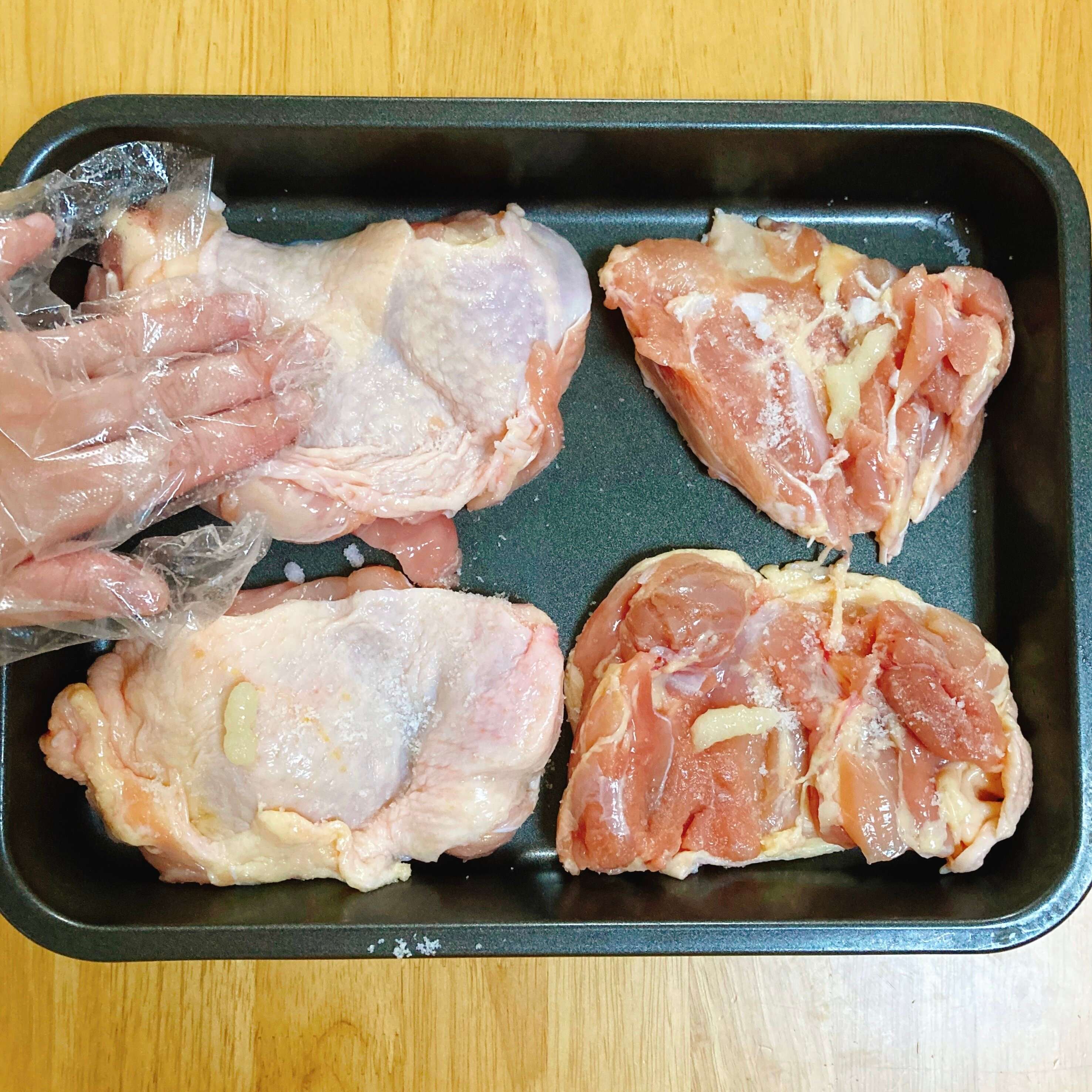 1 鶏もも肉を半分に切り、にんにく・塩をもみ込んで5分置き