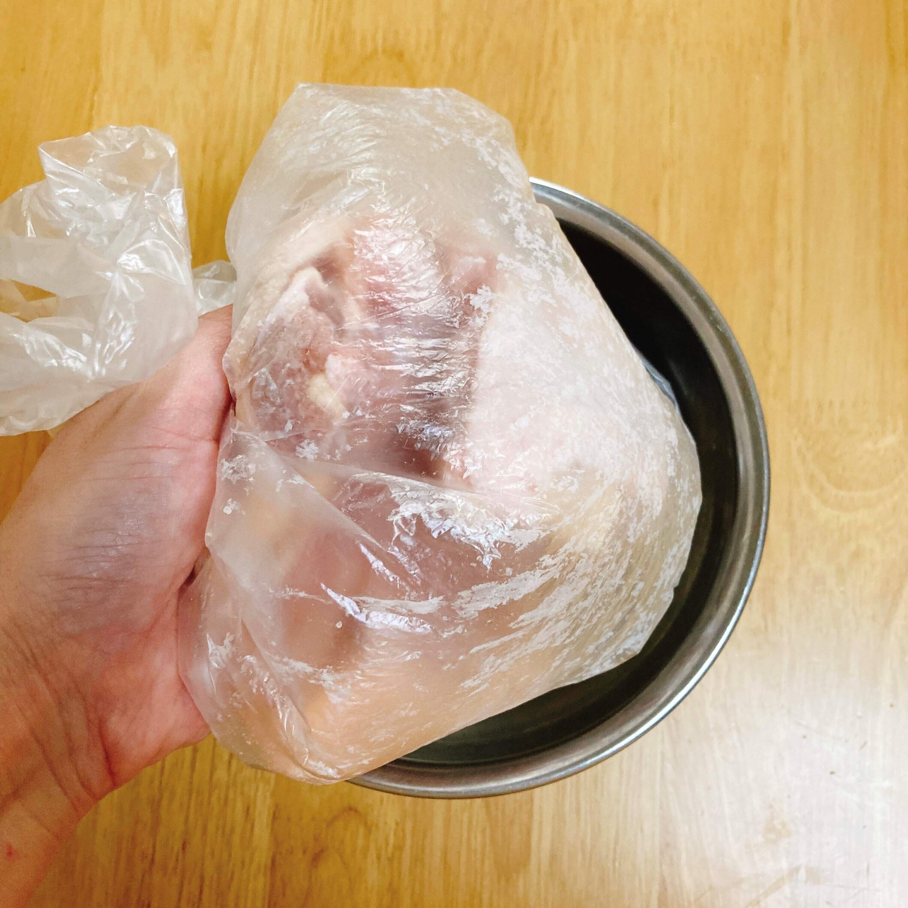 ポリ袋の中で、小麦粉をまぶす。
