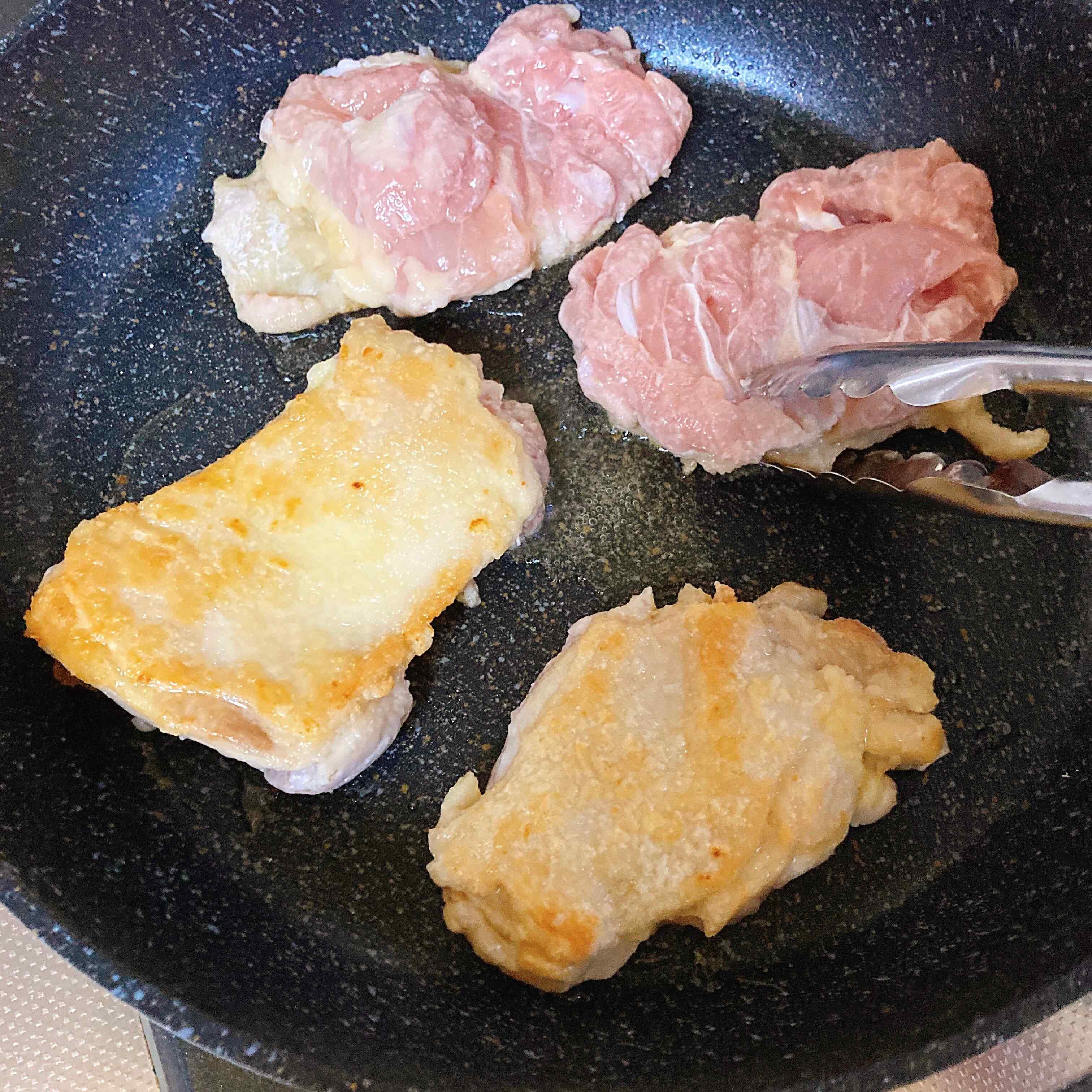 2 油を敷いたフライパンで、鶏肉を皮目から焼いて中火で火を通す。