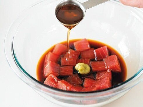 (1)ボウルに[A]を混ぜ合わせ、まぐろを漬け、15分ほどおく。