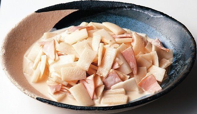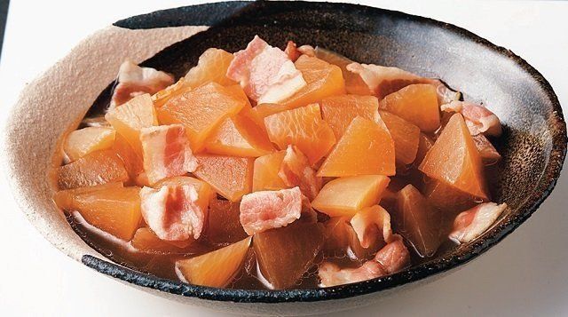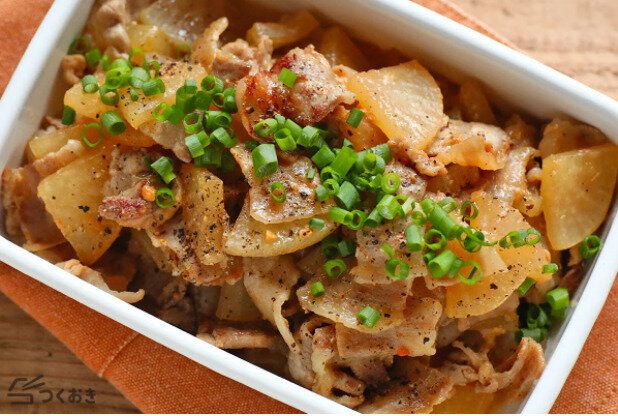 豚バラ肉のうま味とみそとバターのコクが絶妙にからんだ大根は食べ出したら止まらなくなること間違いなし。濃いめの味つけなので炊き立ての白米にぴったりなのはもちろん、お弁当の一品にもオススメです。