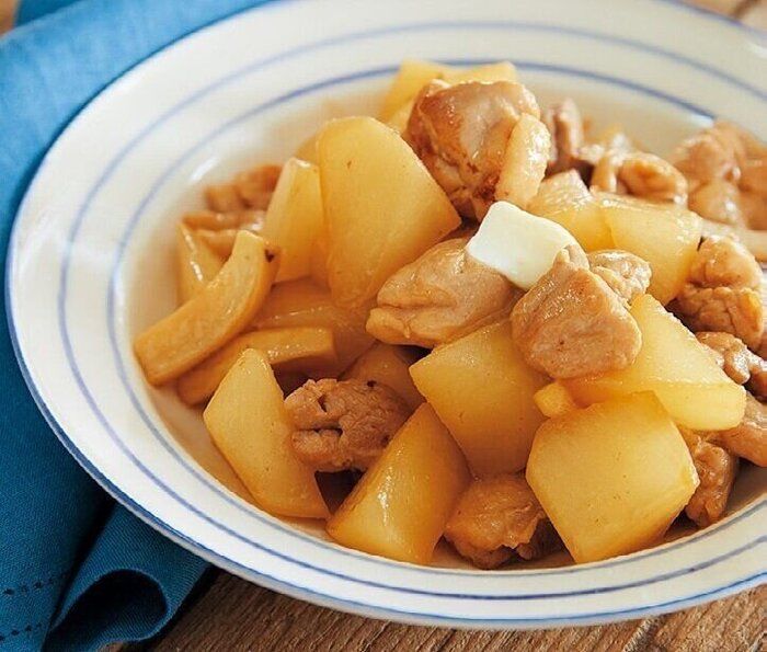 鶏もも肉や大根を炒め煮にしたレシピ。相性バツグンのめんつゆとバターを使った味つけで、コクとうま味が引き立ちます。がっつり食べたい日のメインおかずにもぴったりです。
