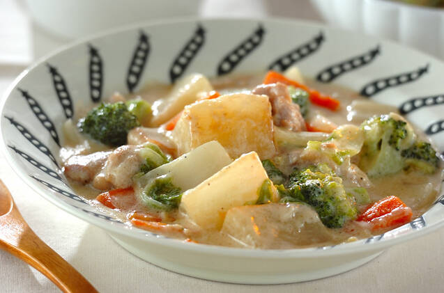 大根が主役のシチューレシピ。大根はあらかじめ電子レンジで火を通すと、調理時間を短縮できます。ホワイトソースを手づくりしても、煮込み時間含めて30分ほどで完成しますよ。
