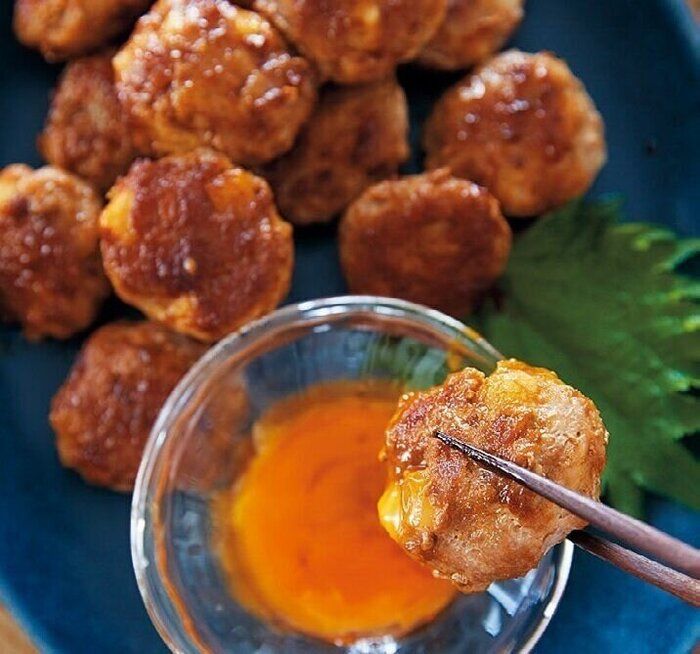 一口サイズでパクパク食べられる、つくねのレシピ。小さくカットした大根がコロコロと入っていて、シャキッとした歯応えを楽しめます。卵黄と青じそを添えて、いっしょに食べるのがおすすめ。