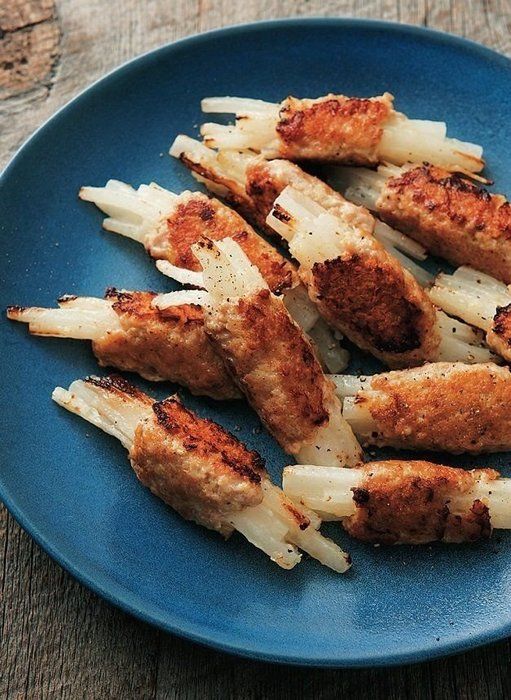 豚ひき肉の肉だねで、細切りにした大根をぎゅっと包むようにまとめます。あとはフライパンにふたをして、転がしながら焼くだけ。大根入りのヘルシーなつくねは、食感がやみつきになりそう。