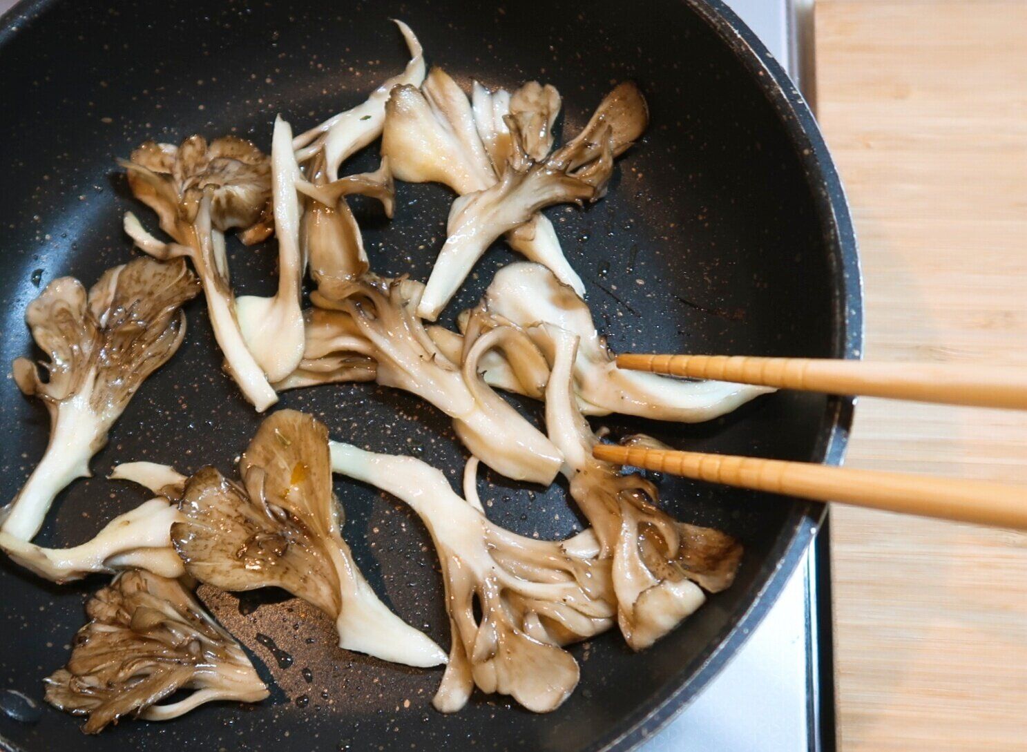 フライパンに半量のオリーブオイル(大さじ1)を強めの中火で熱し、きのこを炒めます。やや強めの火加減にすることで、きのこから水分が出るのをおさえ旨味を残します。