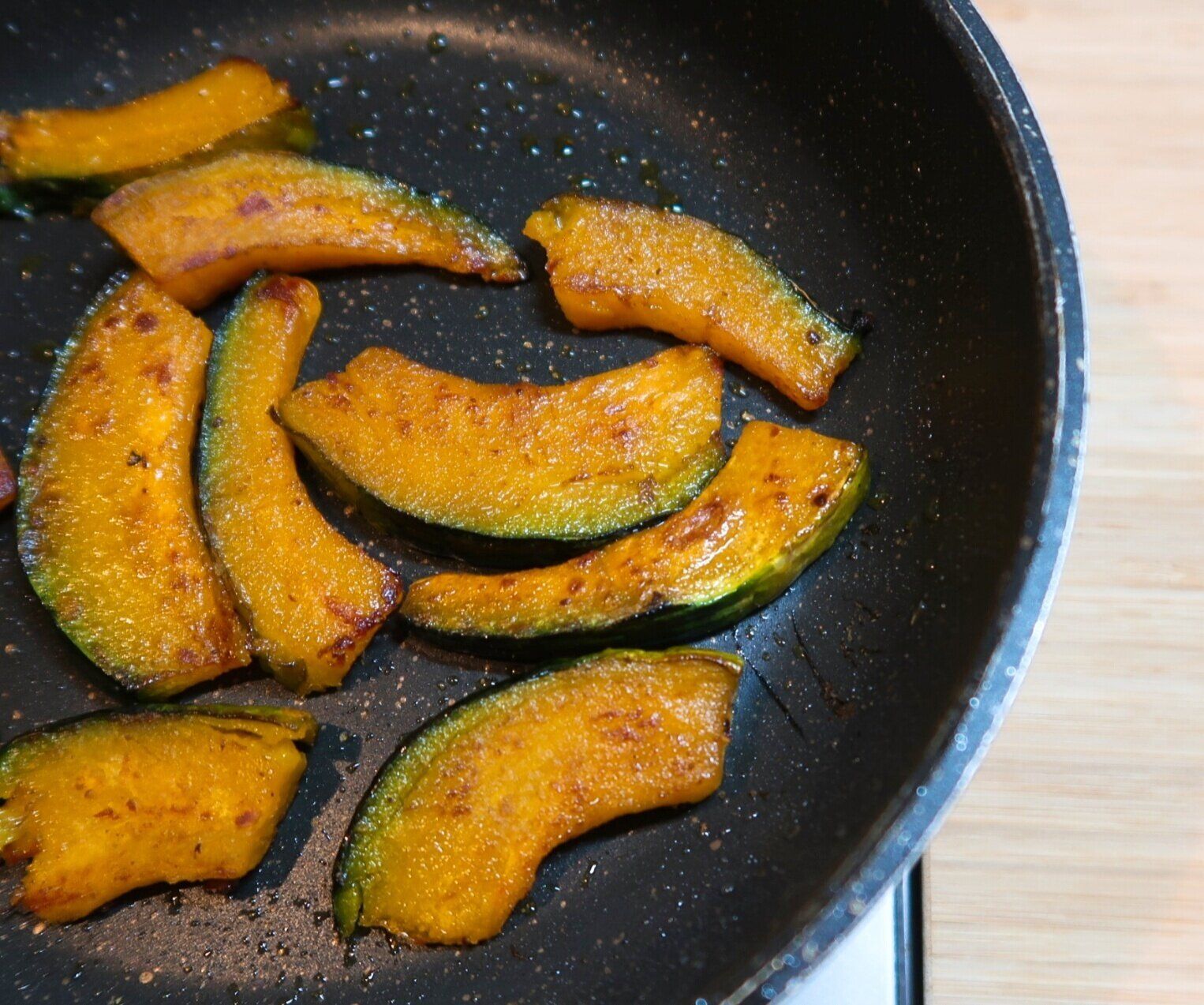 フライパンに残りのオリーブオイル(大さじ1)を中火で熱し、かぼちゃを並べます。こんがり焼き色がついたら裏返し、裏面も同様に焼き色をつけます。仕上げに塩(またはハーブソルト)でかるく味をつけます。