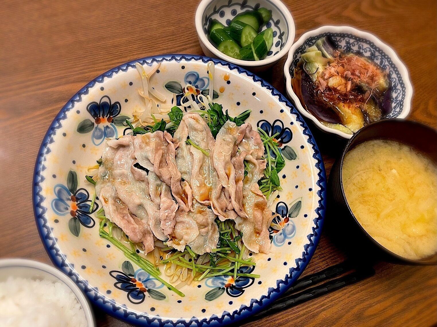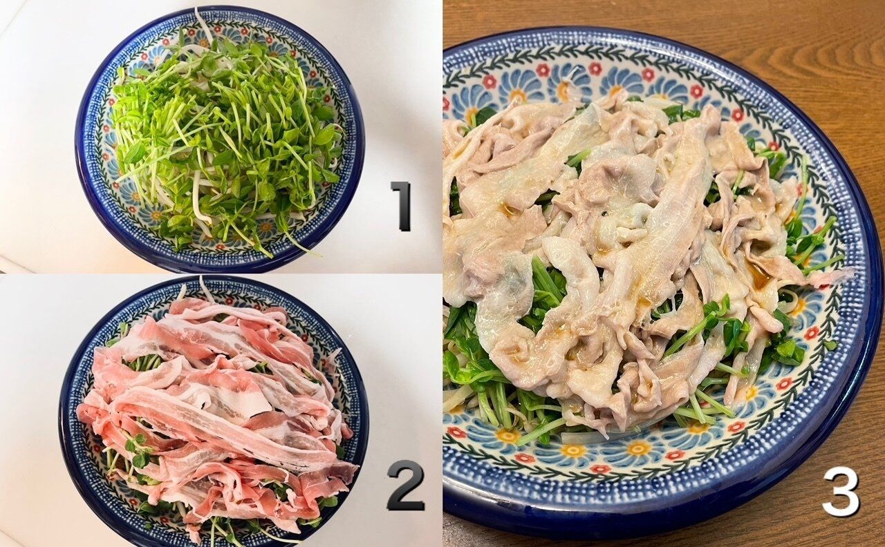 1品目は、豆苗ともやし、豚バラのレンチン蒸しです。