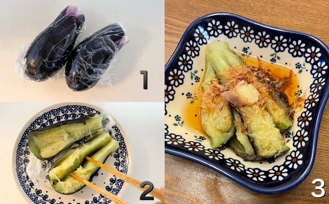 2.ナスをそれぞれラップでくるみ、600Wの電子レンジで3分チンする。