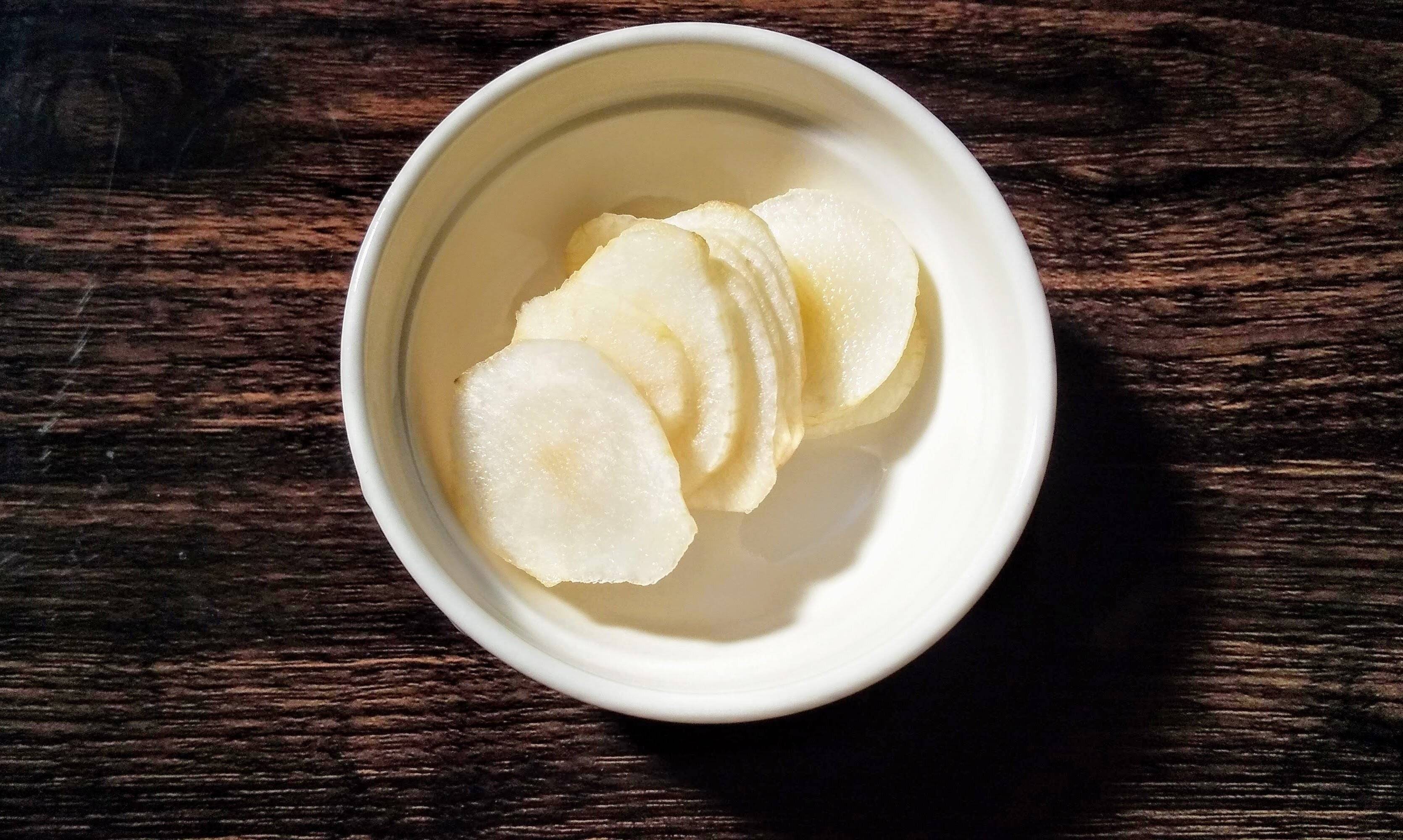 食感はサッと加熱した輪切りのれんこんを思わせるようなシャキシャキ感、風味はごぼうに近い感じ。ショ糖(砂糖の主成分)も含まれているので、ほんのりとした甘さを味わうこともできます。