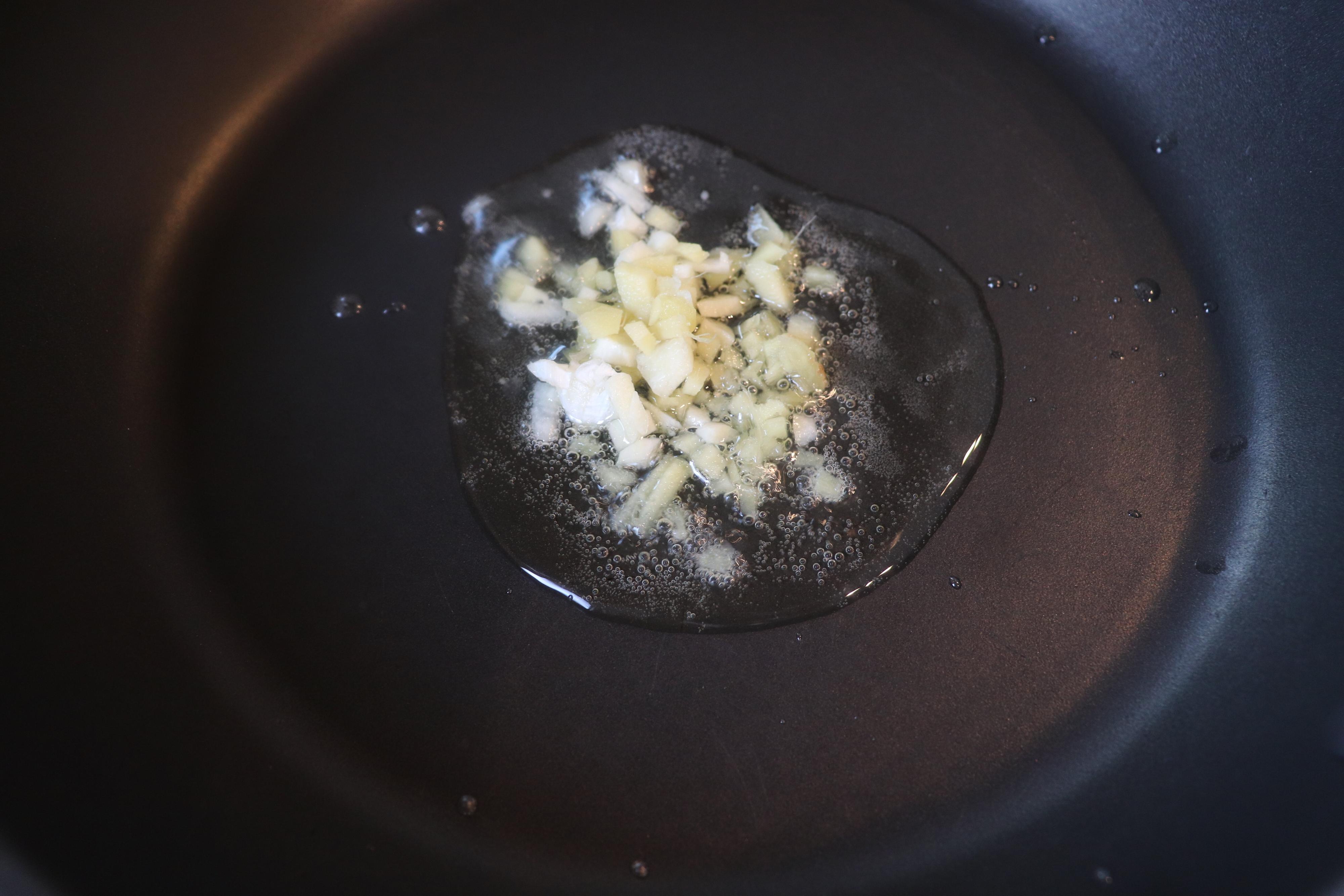 1.フライパンに米油を入れて、しょうが、にんにくを弱火で炒める。