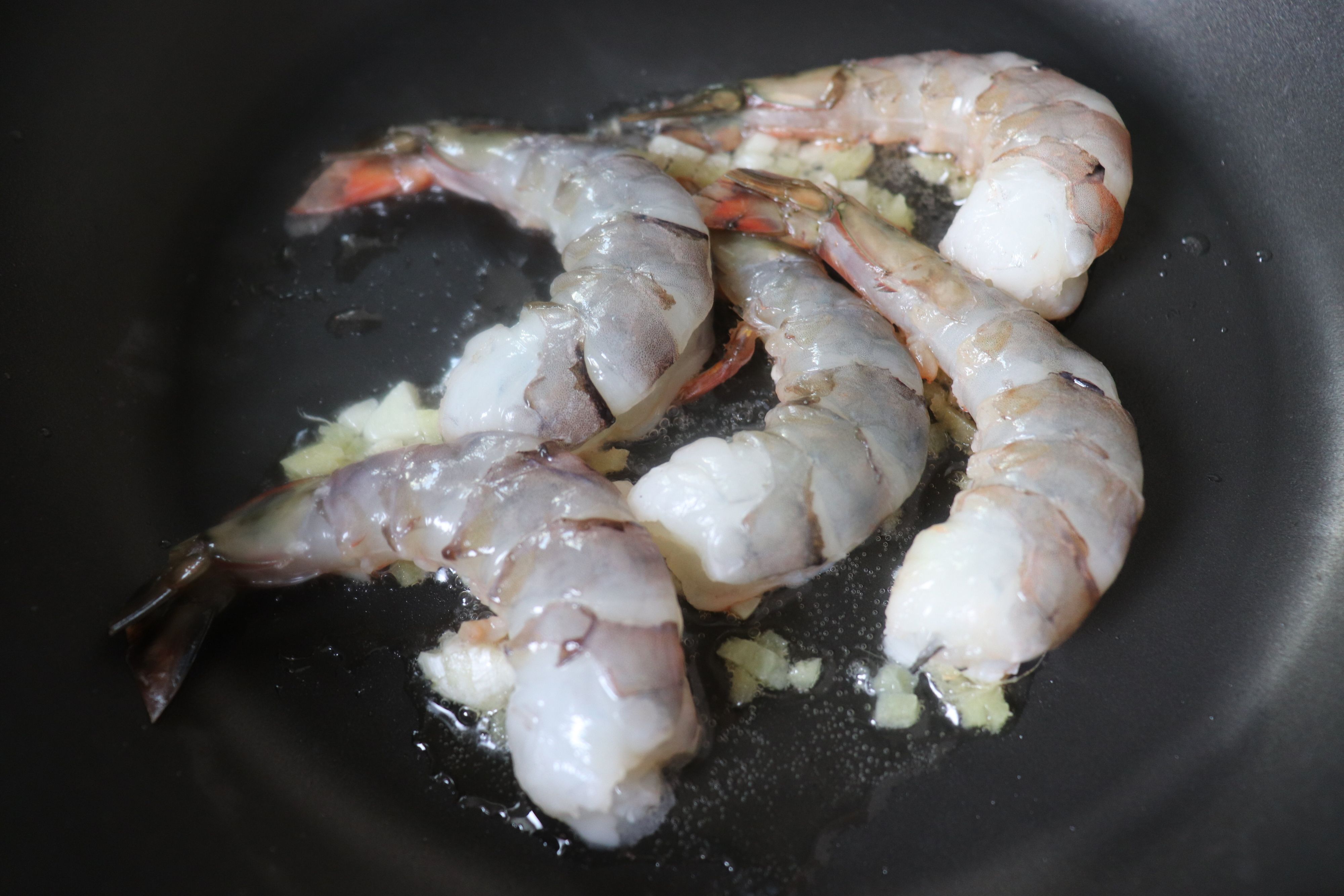 2.しょうが、にんにくの香りがしてきたら、海老を入れて、中火で両面を焼く。