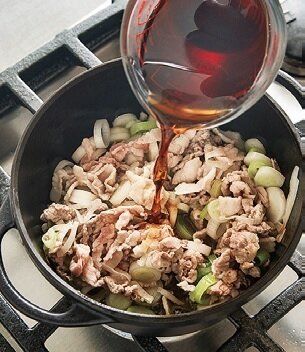 豚肉とねぎを炒めてから、めんつゆを入れると、うまみたっぷりのつゆに。