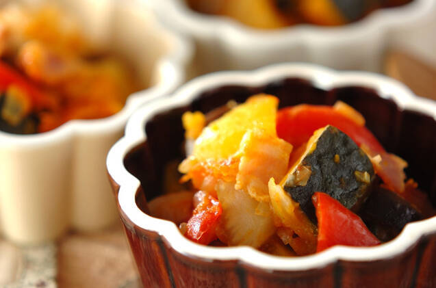 パプリカやかぼちゃなどがたっぷり入った、具だくさんのラタトゥイユ。野菜の水分だけで煮込むことで、野菜の甘味やうま味が引き立ちます。多めにつくって冷蔵保存しておくと、パスタやグラタンなどにもアレンジできて便利ですよ。
