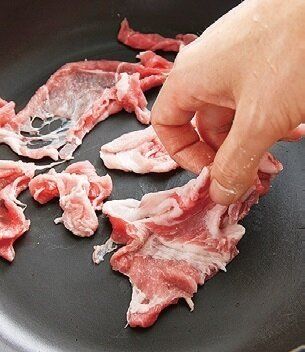 豚肉は切らずに1枚ずつ広げてフライパンに入れてから、炒める。ボリュームのある炒めものになり、香ばしく焼けて、火の通りも早い。