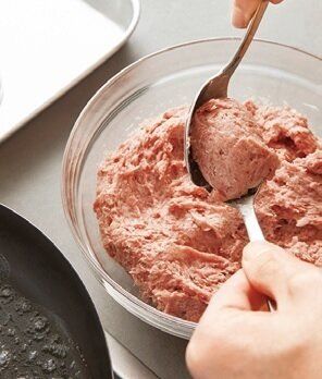 ボウルにハンバーグだねの材料を入れ、手でよく練り混ぜる。マッシュルームは手で割る(写真)。たれの材料は混ぜ合わせる。