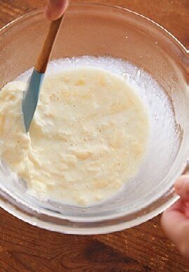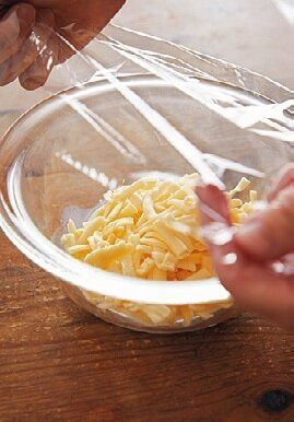 チーズは広口の耐熱容器に入れ、ふんわりとラップを掛け、電子レンジで1分30秒~2分加熱して溶かし、よく混ぜて(2)の上にかける。