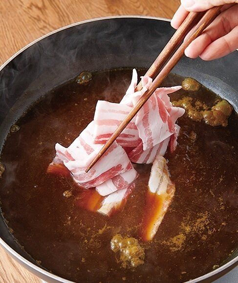 薄切り肉はすぐ火が通るので煮ものも早くできる。煮汁を煮立てたところに豚肉を入れる。