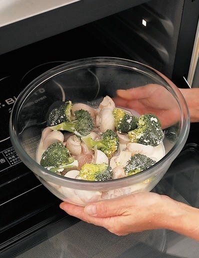 鶏肉は、塩小さじ1、こしょう少々をすり込み、白ワインをもみ込み薄力粉をまぶす。耐熱ボウルに、鶏肉、マッシュルーム、ブロッコリー、玉ねぎ、生クリームを入れて混ぜる。