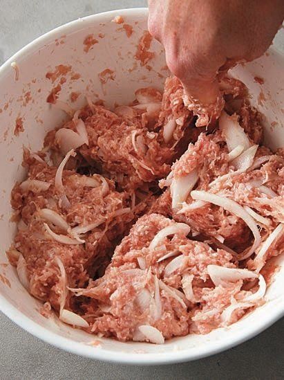 ボウルに、ひき肉、[A]を入れて練り混ぜ、粘りが出たら玉ねぎ1個分を加えて混ぜる。16等分にして、1個ずつざっくりと円形にまとめる。フライパンにサラダ油を薄くひき、肉だねを並べる。
