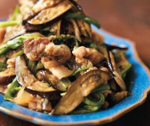 揚げ油を中温(170℃)に熱し、なすを色よく揚げて油をきる。続いて、豚肉を揚げ油に入れ、時々返しながら3分ほど揚げる。こんがりとしたら、油をきる。