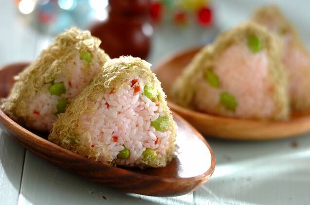 カリカリ梅のピンクと枝豆のグリーンが色あざやかで、見た目もかわいいおにぎりのレシピです。梅の酸味と枝豆のやさしい甘味のさっぱりした味わいなので、夏バテ気味なときにもオススメです。