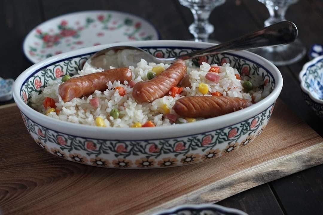 米と玉ねぎ、ミックスベジタブル、ウィンナー、コストコのオーガニックチキンストックなどを炊飯器に入れてスイッチを押すだけ!ボリュームも見た目も華やかなご飯のできあがりです。