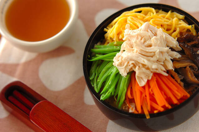 奄美大島の郷土料理である「鶏飯」風のお弁当レシピ。同じだし汁でにんじんやささみを加熱するので、意外と手間がかかりません。保温ポットにだし汁を入れて、食べる前にかけましょう。