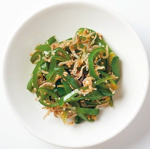 細切りにしたピーマンとちりめんじゃこに、ごま油を加えて混ぜ、ラップをかけて電子レンジで1分加熱。粉山椒、しょうゆ、白いりごまであえれば、箸が止まらないおいしさの一品が完成!