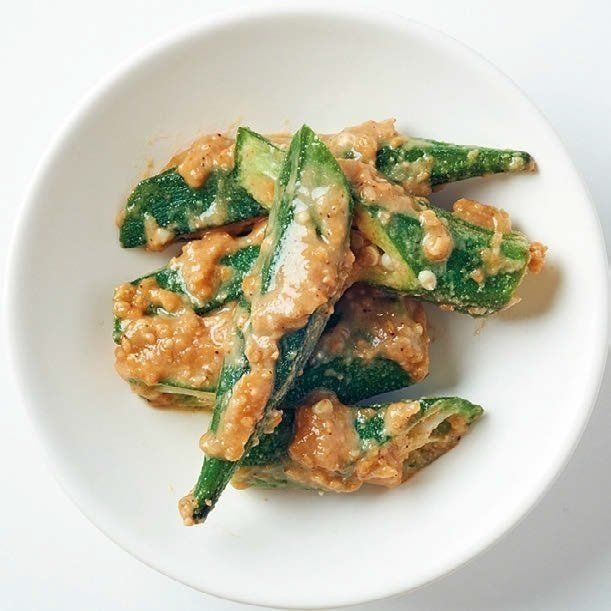 メインおかずがサッパリ系のときや、しょうゆベースのときには、みそベースのコクうまオクラはいかがでしょうか。電子レンジで加熱調理したオクラに、練り辛子、砂糖、みそ、白すりごまを加えて混ぜ合わせるだけ!