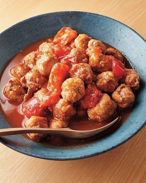 豚こま切れ肉でだんごをつくります。だんごに火が通ったらトマトを加え、仕上げに焼き肉のたれと酢をからめて。さわやかなトマトが食欲をそそります!