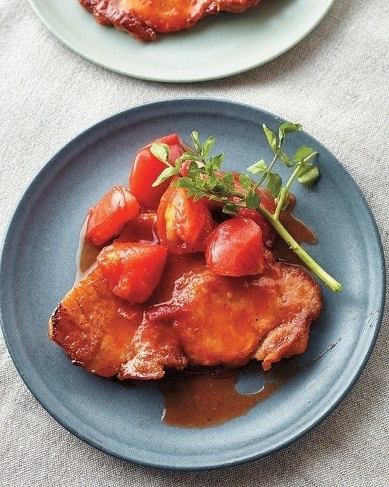 豚肩ロースとんカツ用肉を焼きます。煮からめるのは、めんつゆ、みりん、トマトのザク切りを加えたもの。トマトを入れるだけで、いつものお肉料理も脱マンネリに!